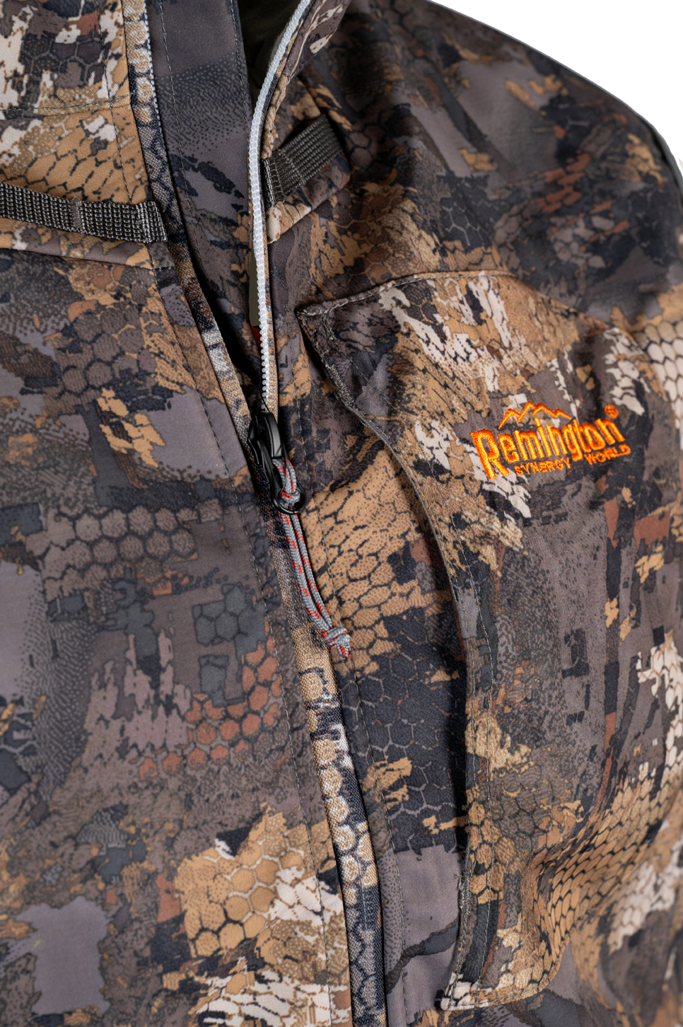 The Remington Top Shooter Timber vest is designed for individuals who enjoy outdoor activities, fishing, or hunting. The internal windproof flap with a zipper helps retain warmth in the inner space. Personal items can be stored in five pockets. The bottom of the vest features a volume adjustment with a drawstring that can be adjusted from the pocket, maintaining the aesthetic appearance of the garment. The signature camouflage enhances the overall look.